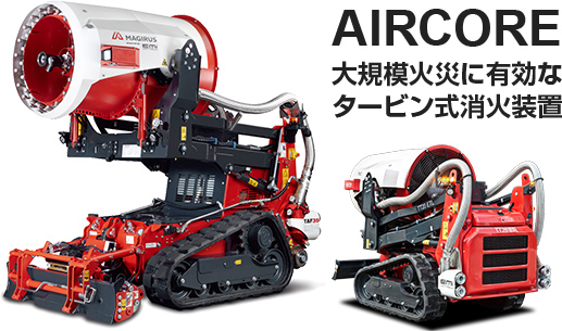 AIRCORE(エアコア)は、大型タービンの大風量と4,000L/minの大量放水によって、大規模火災現場の冷却・排煙・消火が効果的に行える新しい消火装置です。