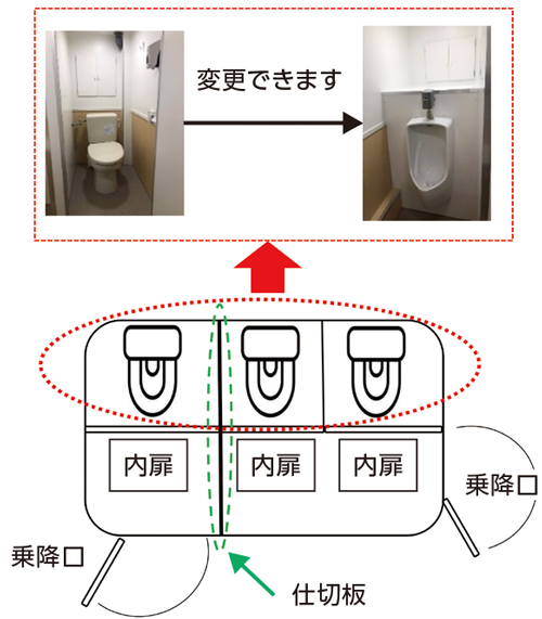 室内に仕切板を設け、乗降口を2つ設置することで男女兼用トイレとして使用することができます。