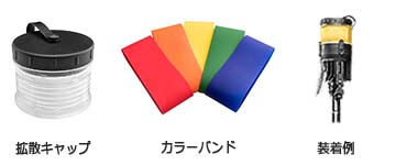 | ● 組み立て容易 | 照明部、伸縮柱付き折り畳み式三脚、バッテリー部分が分離でき、 約90秒で組み立てが可能 |